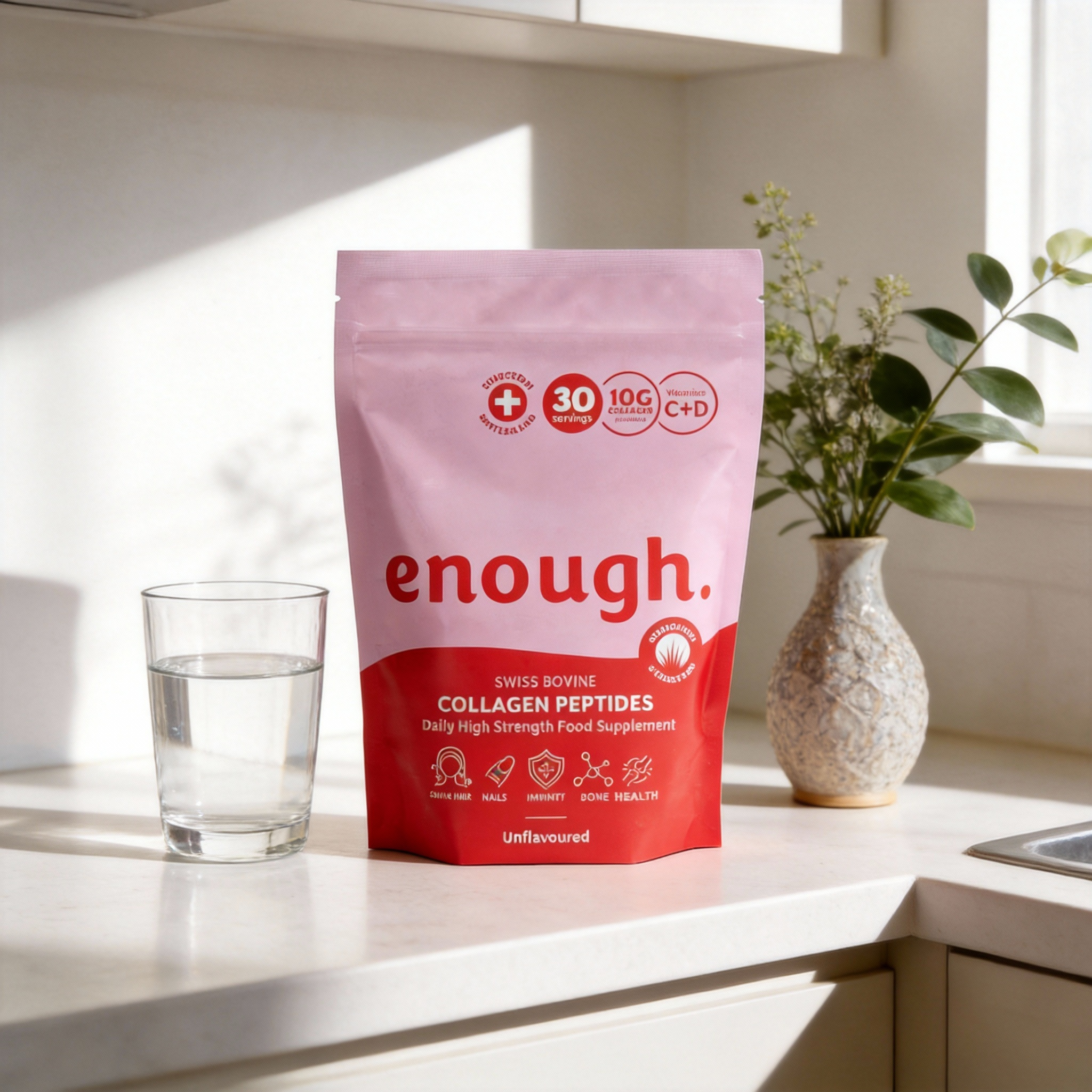 Enough Wellness products are crafted with your needs in mind. Our collagen supplement is sourced from high-quality Swiss bovine collagen, ensuring purity and effectiveness. With a focus on minimal ingredients, it delivers maximum benefits. The combination of collagen with vitamins C and D provides a comprehensive approach to supporting skin, joints, and bones. Learn more about the benefits of collagen peptides here.