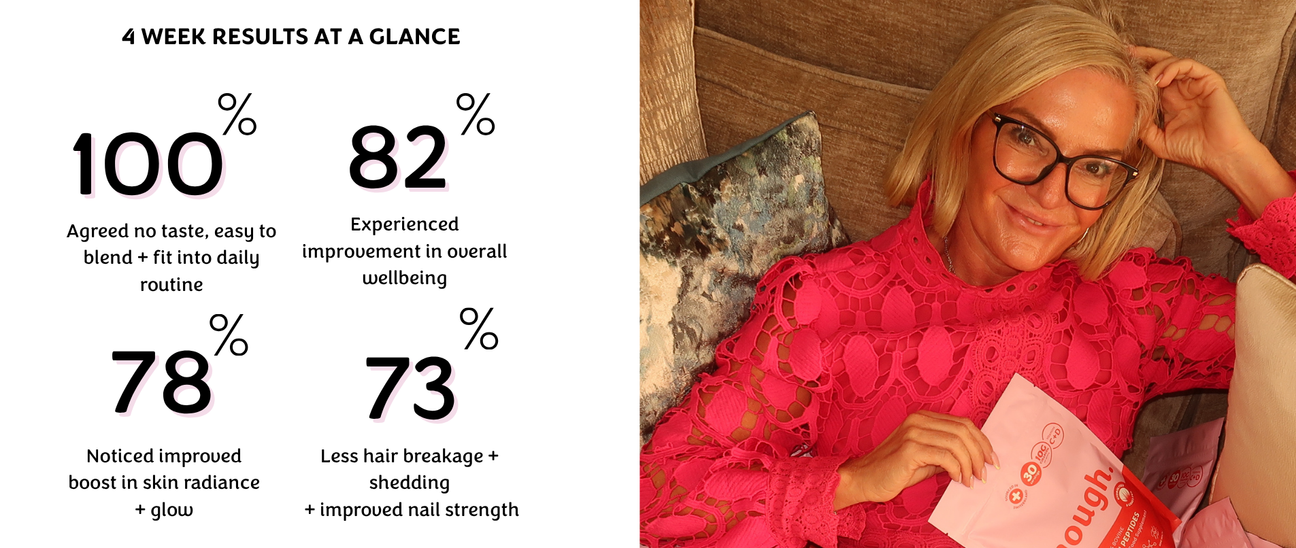 We’re so confident in the power of our products that we conducted a consumer trial with 50 women who took our collagen daily for a month and the results were nothing short of mind-blowing. An incredible 78% reported improved skin radiance and glow in just 4 weeks! And remember, consistency is key. The longer you take collagen, the better your results will be. Who wouldn’t want to experience stronger, healthier, and more radiant skin every day?