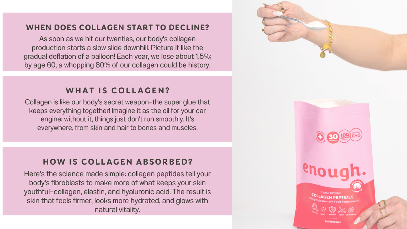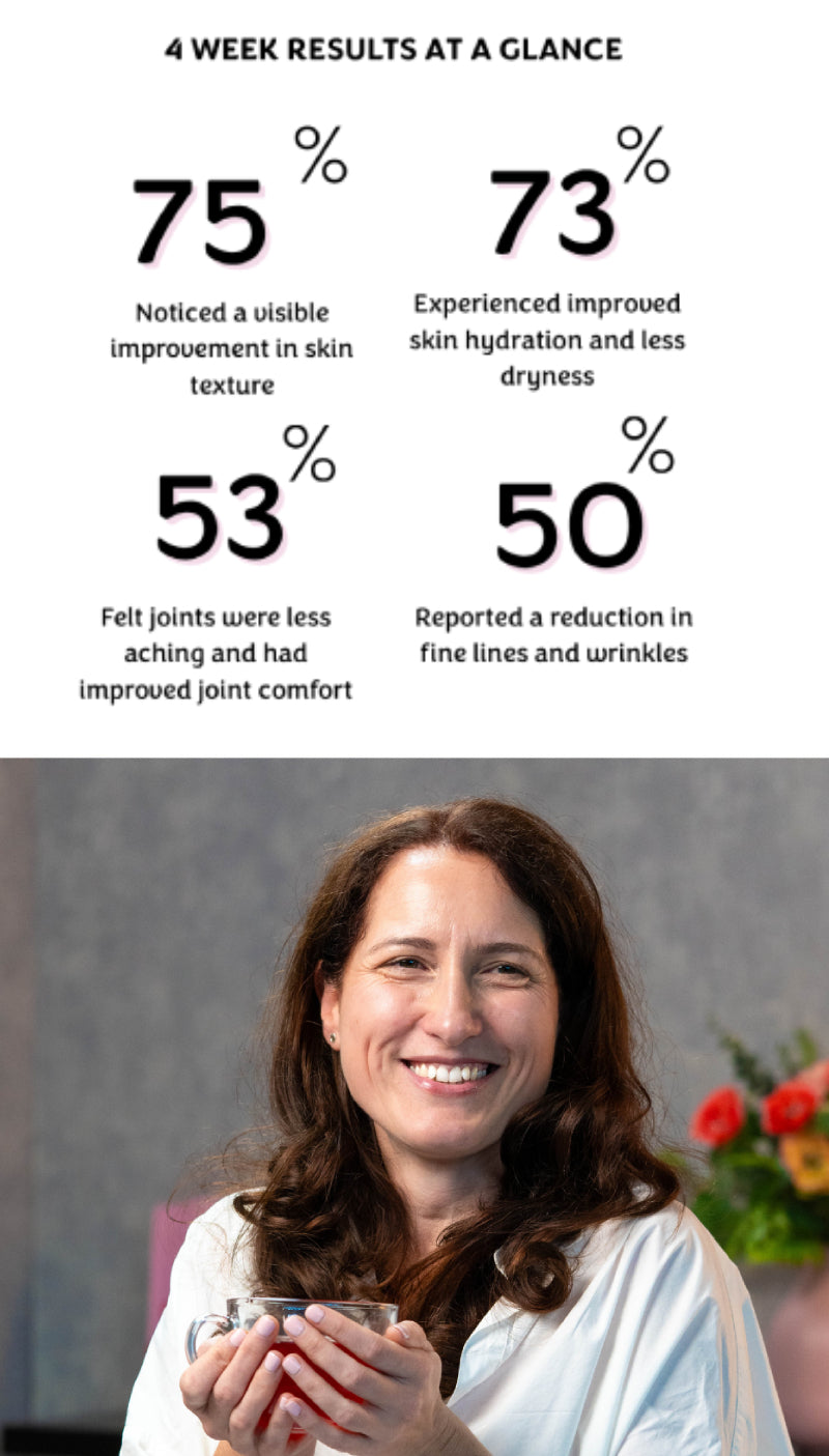 | Our starter pack provides 30 servings of our premium Swiss Bovine Collagen Peptides which contains 10,000mg - Type 1+3 bovine collagen with vitamins C+D. We're calling time on unnecessary ingredients. Our unique blend of collagen powder benefits women of all ages; helping you clear through the fog and confusion. Our highly bioavailable, clean, Swiss-sourced collagen delivers everything you need and nothing you don't! 10,000 mg of high-strength collagen per serving for maximum benefits you’ll see and feel. See what our amazing community thinks about our best collagen supplement down below! |